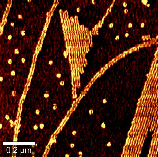 Imagen de fase AFM, modo no contacto, de una cadena larga de moléculas poliméricas.