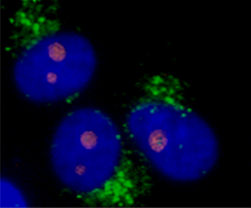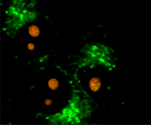 Imágenes Raman y de fluorescencia correlativas de células en cultivo. Izquierda: núcleos celulares teñidos con el marcador de fluorescencia DAPI. Centro: Retículo endoplásmico (verde) y nucleolos (naranja) identificados con Raman. Derecha: Imagen superpuesta.