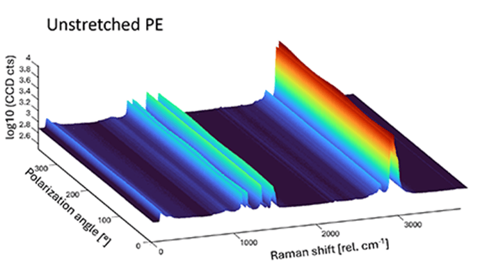 Espectroscopia Raman de polietileno (PE) en función de la polarización que revela la alineación de fibras inducida por estiramiento dentro de una lámina de plástico de PE. Los mapas térmicos 3D visualizan la intensidad Raman dependiente de la polarización para varios modos, incluyendo el estiramiento simétrico C-C (1130 cm-1 rel.), la flexión CH2 (1417, 1441 y 1464 cm-1 rel.), y el estiramiento C-H (2849 y 2883 cm-1 rel.) en la condición estirada (derecha).