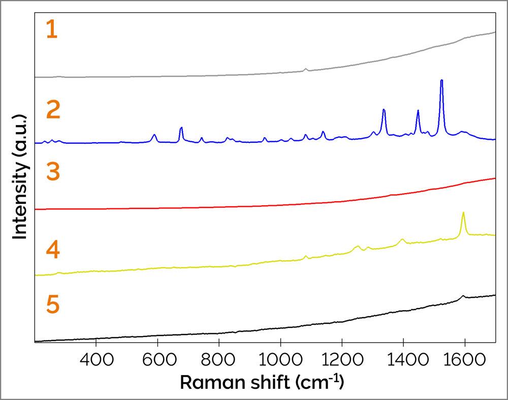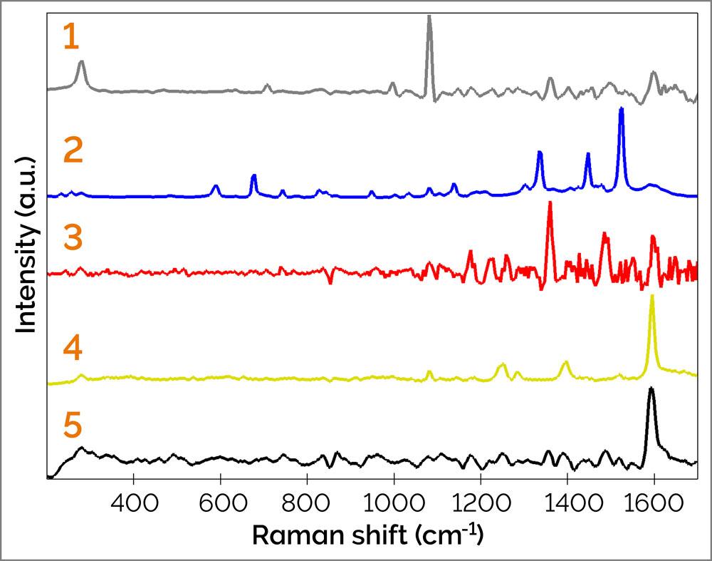 Análisis Raman de un póster a través de un cristal protector. La iluminación con luz blanca y la cámara mostraron manchas de tinta de diferentes colores. Inicialmente, los espectros Raman registrados en las posiciones indicadas con un láser de 532 nm estaban parcialmente oscurecidos por un fondo elevado, pero posteriormente se revelaron mediante sustracción de fondo.